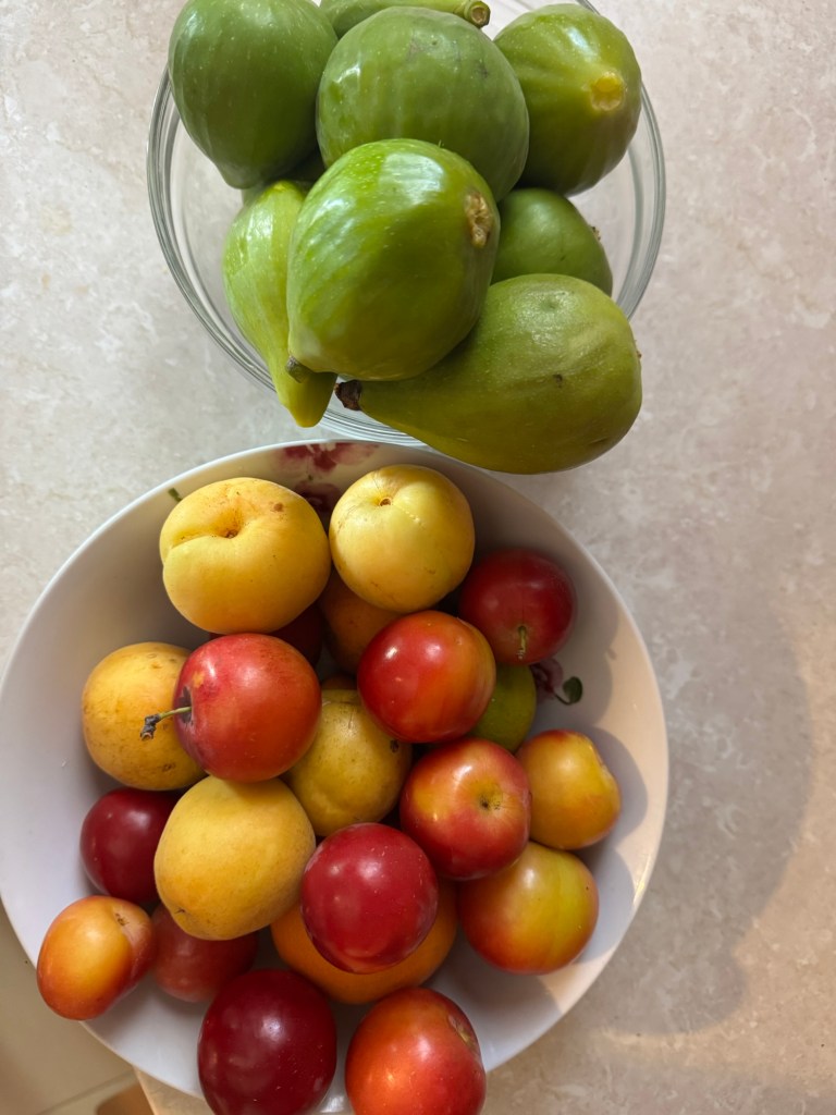 The hosts of our Airbnb, George and Katerina, live in the upstairs of the house we are staying in. They were both there to meet us, having happily agreed to allow us to arrive at 10am as we had caught the overnight ferry from Puglia in Italy. They both work in hospitality, clearly the main industry and employer in the region – she during the day and he does the 4pm to midnight shift. The house is surrounded by fruit trees, and they couldn’t have been more welcoming and generous in providing us with initial provisions and insisting we help ourselves to the fruit at any time. Each day we find fresh produce on our doorstep: lettuce one day, the next day fresh eggs and apricots, then plums and more apricots. We have also enjoyed kumquats, mulberries, figs, cherries and tiny plums from the tree. George’s parents tend the garden and vegetable patch next door and each day his father greets us with a warm smile and a greeting of “Kalimera” (good morning). Having offered us fresh potatoes three days in a row, he was delighted that we accepted the offer today, foisting on us three times as much as I would have selected for myself.