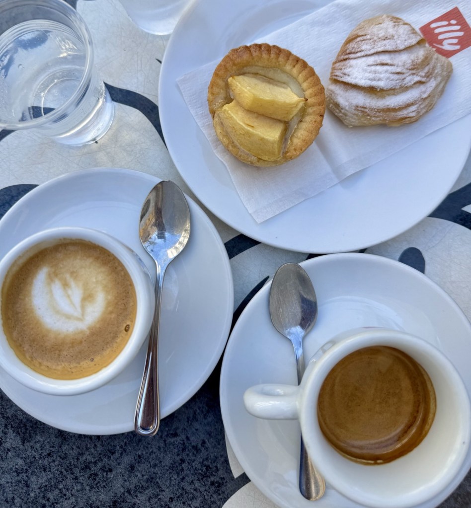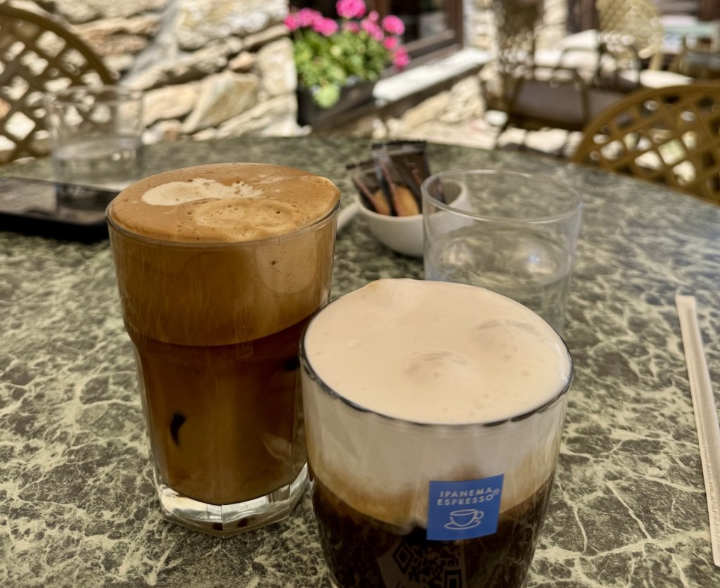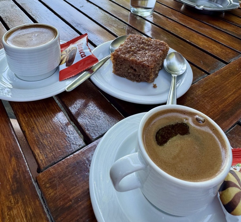 • Coffee: A “piccolo latte” in Sardinia is a “noisette”. Italian espressos are very short and cheap, a double espresso costs double and a cappuccino at least three times the cost of an espresso. Greek coffee needs a little sugar, and freddo cappuccinos are fabulous, but need stirring before drinking. Coffees in Greece always come with a complimentary biscuit or piece of cake. In both Italy and Greece, coffee comes with a glass of water – perhaps to balance the effect?