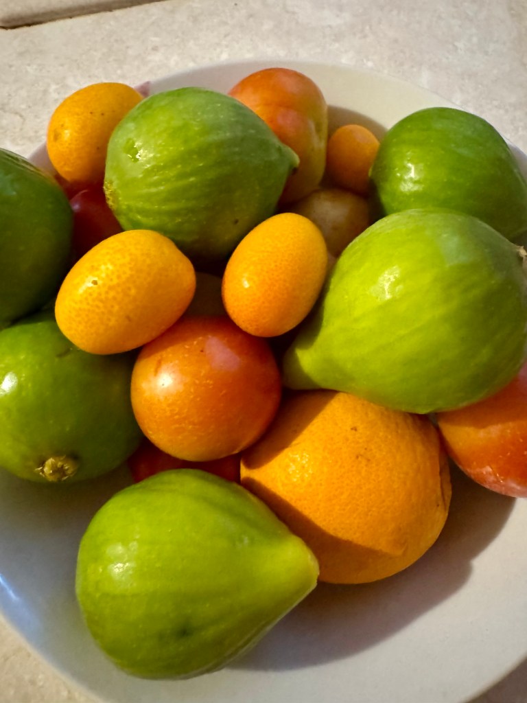 • There is nothing quite like eating fresh fruit, picked off the tree – cherries, figs, kumquats, plums, apricots, oranges, mulberries and red currants have all been sampled. Fresh potatoes, cooked straight after being pulled out of the ground bring a whole new respect for the starchy tuber. And the other local vegetables such as tomatoes, peppers (pointy capsicum), eggplant, onions and garlic sold by the local truck that pulls up on the side of the road, taste magnificent. These fresh fruit and vegetables make dreaming up recipes an easy delight.